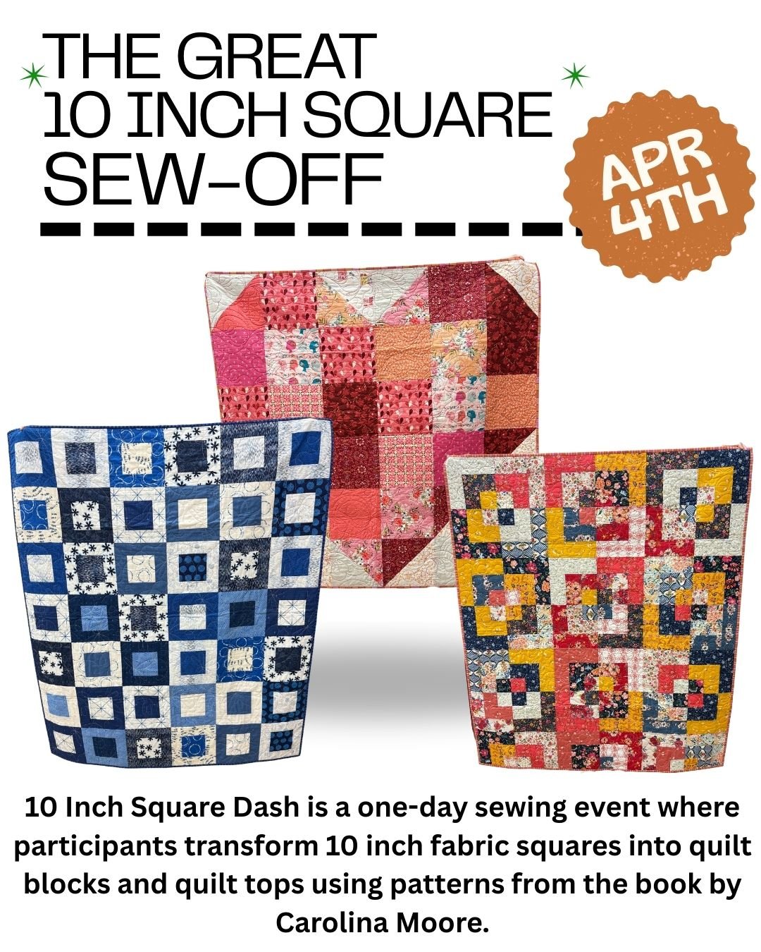 | Details: | Get ready for a fast-paced and fun day of sewing at Webfabrics! Inspired by the energy of a classic Jelly Roll Race, the 10 Inch Square Dash is a one-day sewing event where participants transform 10 inch fabric squares into quilt blocks and quilt tops using patterns from the book by Carolina Moore. We’ll kick off the day with a mini trunk show featuring quilts made from Carolina Moore’s 10-inch square patterns to spark ideas and help you choose the design you’d like to make. From there, it’s time to cut, sew, and dash your way through a lively afternoon of quilting. Throughout the day you’ll enjoy demos, sewing challenges, and plenty of encouragement as everyone works toward completing a quilt top—or getting well on their way. Expect a relaxed, social atmosphere with prizes, inspiration, and lots of creative energy. Whether you’re looking to sew with friends, try a new pattern, or finally dive into that stack of 10 inch squares, this event is the perfect way to spend a creative afternoon. What to Bring